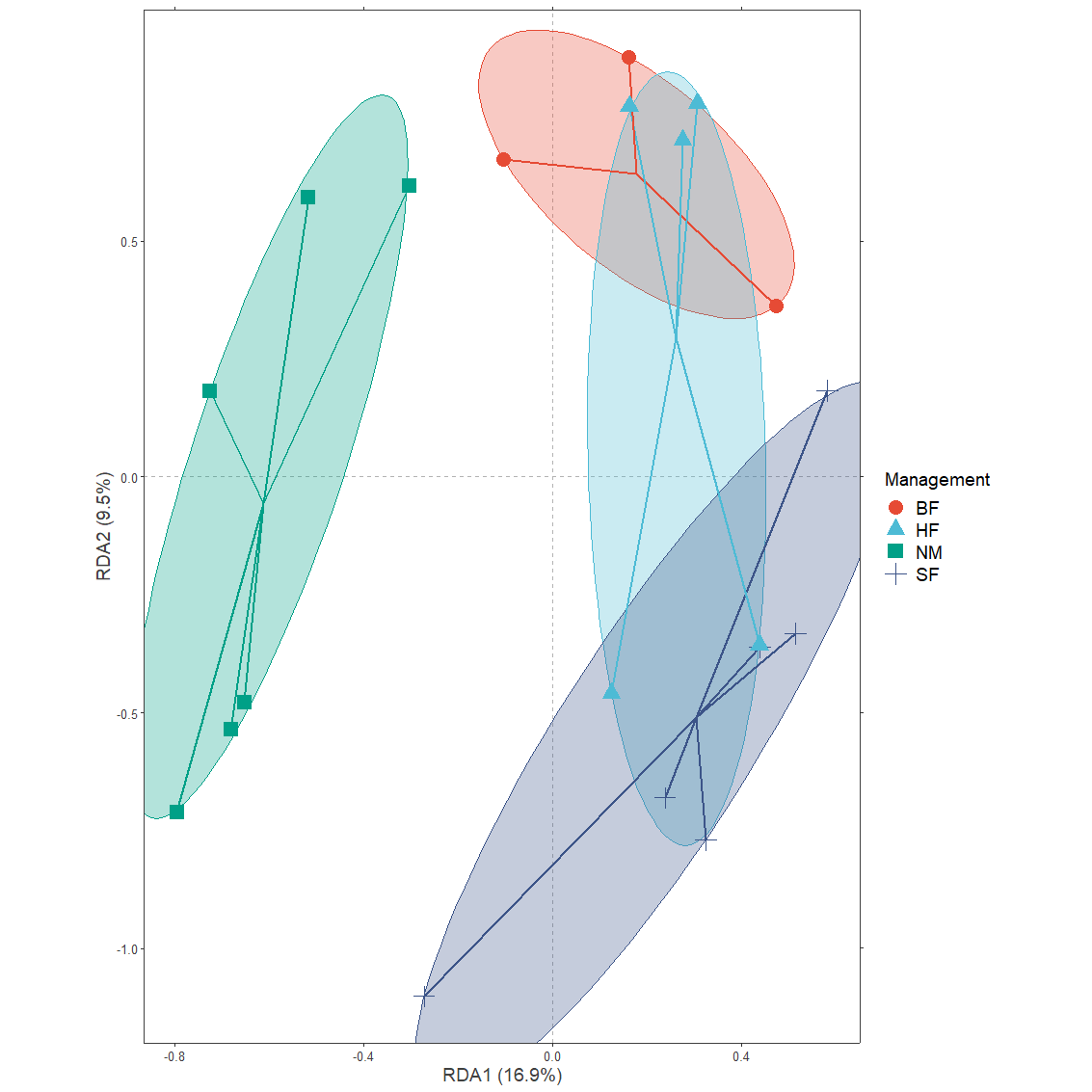 dune.Hellinger <- rda(dune.Hellinger ~ Management,