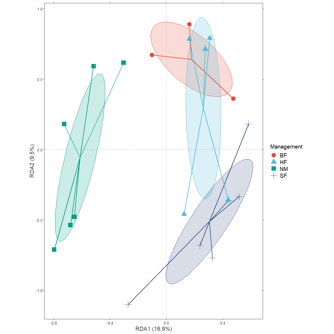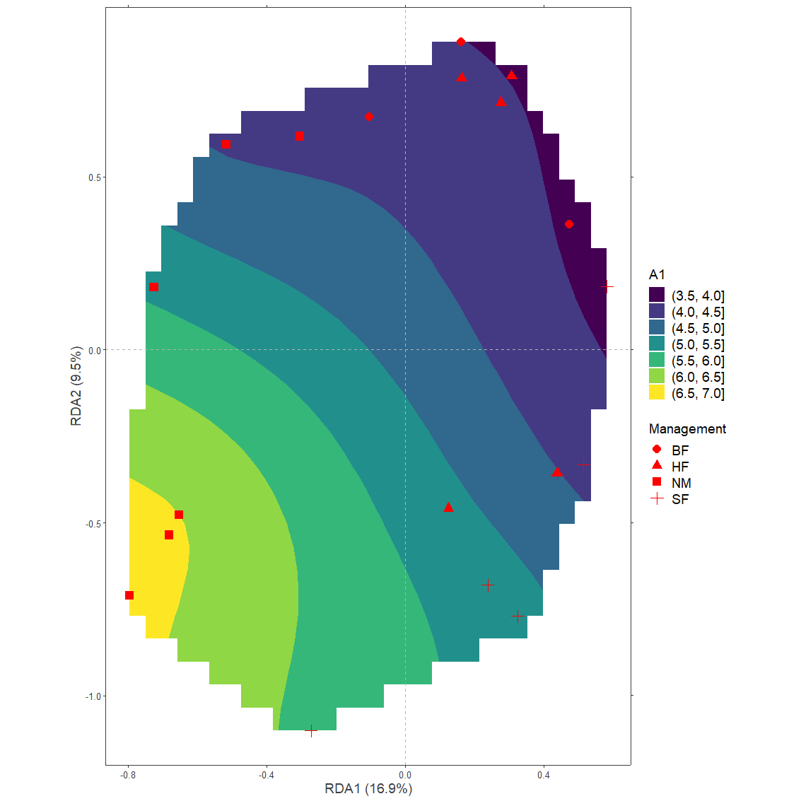 #> rda(formula = dune.Hellinger ~ Management, data = dune.env, scaling = "species")