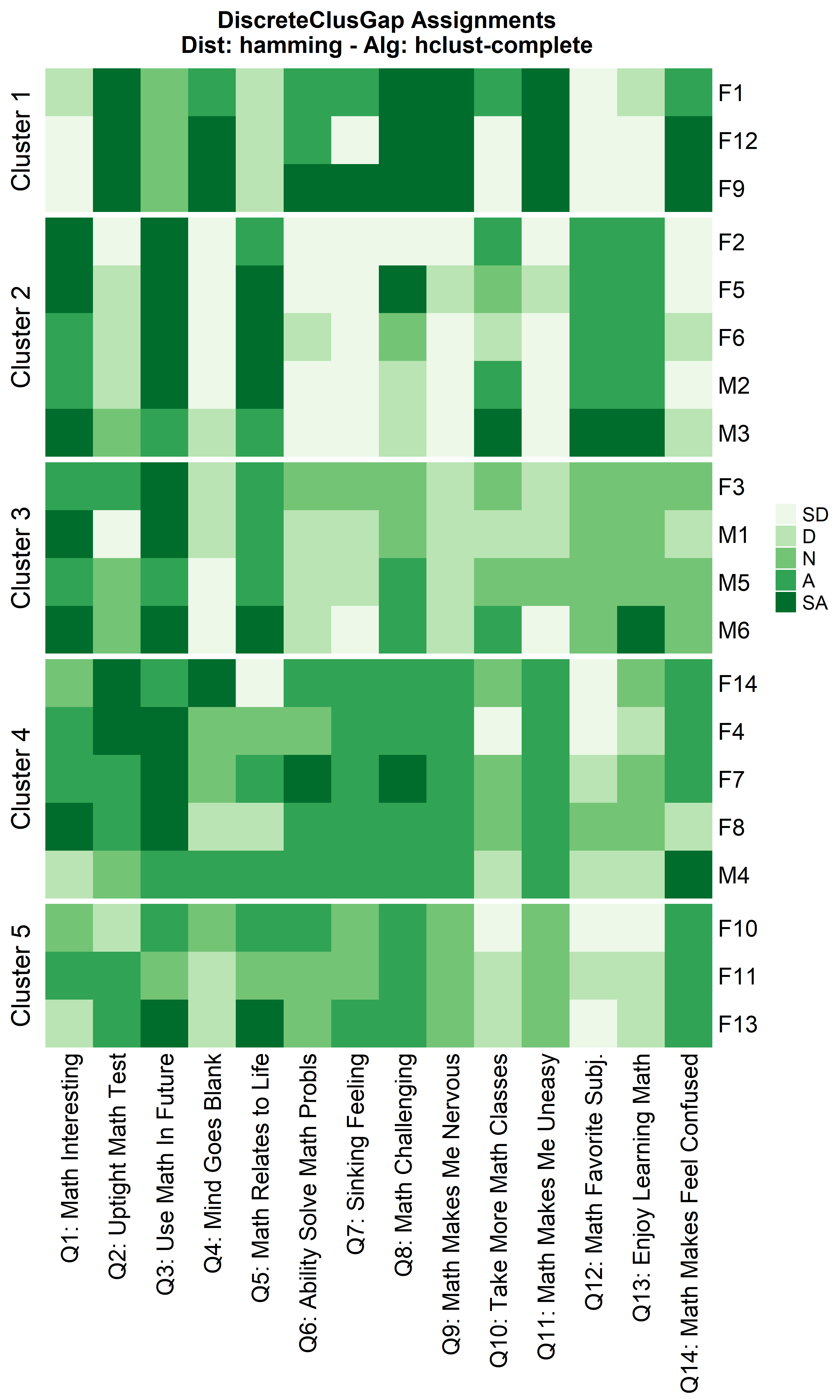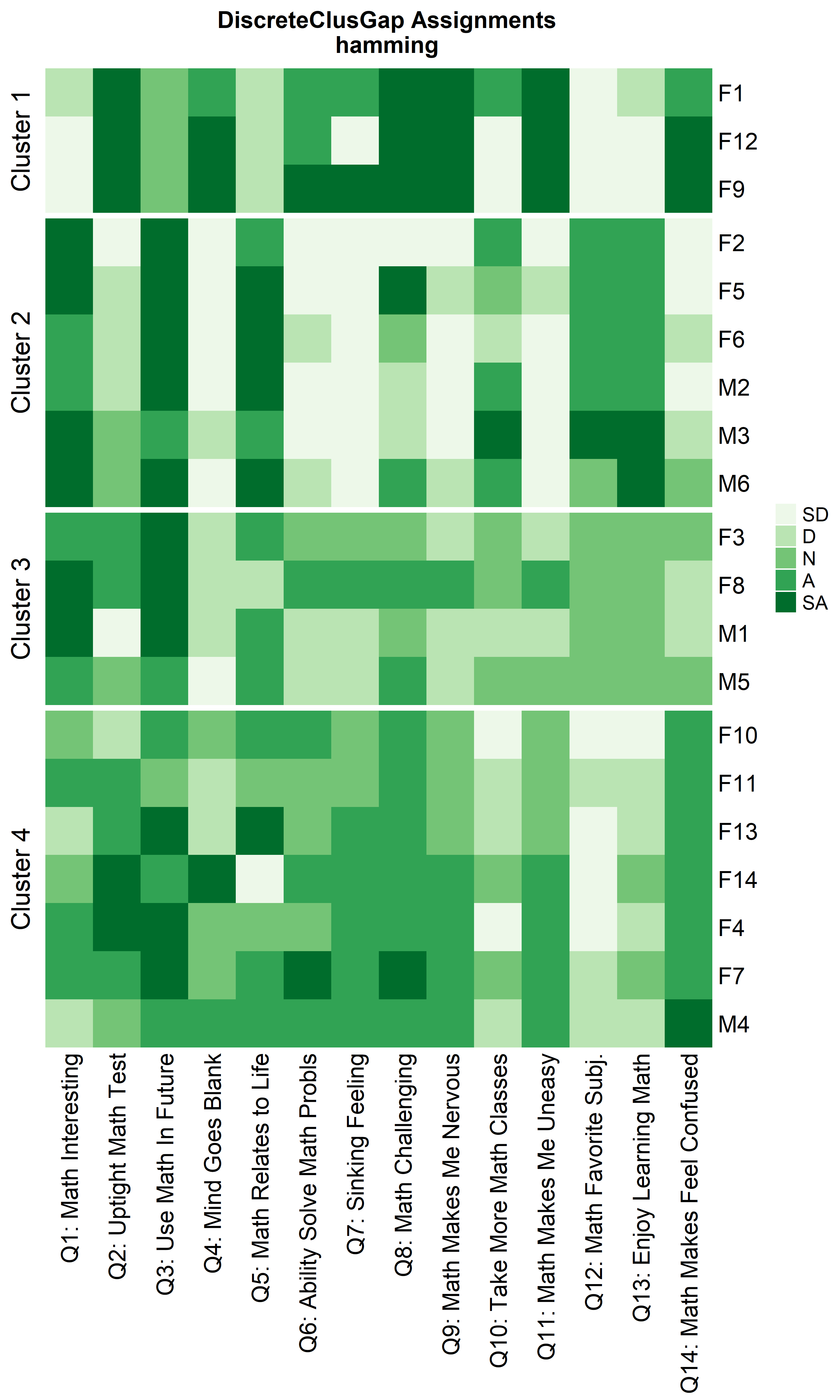 the Math Anxiety data using the Hamming, \(\chi^2\), and Cramer’s V distances applying