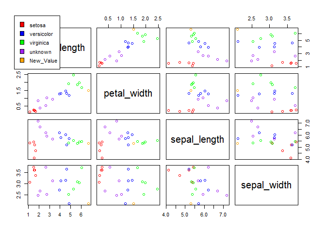 knn(db_flowers,"ClassLabel", c(6.7, 1.5, 5.3, 2.1), "Euclidean", 2, details = TRUE, waiting = FALSE)