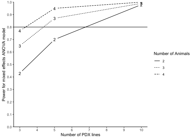 <- PowANOVA(ctl.med.surv = 2.4, tx.med.surv = 7.2, icc = 0.1, sigma2 = 1, sim = 100, n = c(3, 5, 10), m = c(2, 3, 4))