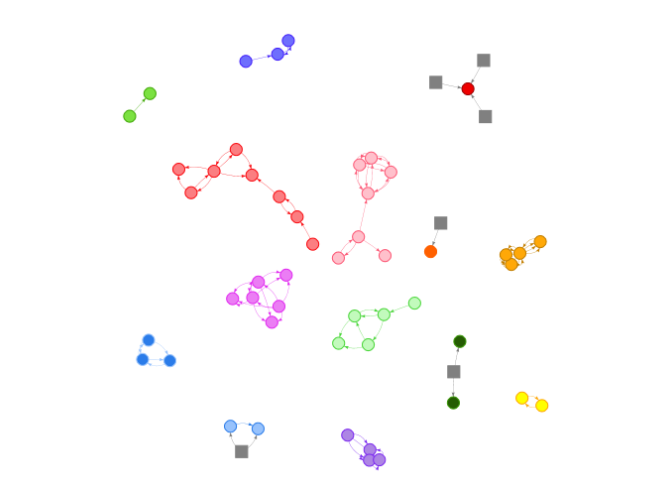 Os diferentes agrupamentos representam empresas suspeitas de praticarem alguma ação colusiva num determinado mercado. Cada agrupamento é representado por uma cor diferente. As arestas apontam no sentido de um perdedor para um vencedor de licitação. Empresas que são sempre perdedoras, não tendo sido vencedoras de nenhuma licitação no período analisado, são representadas por quadrados cinzas.