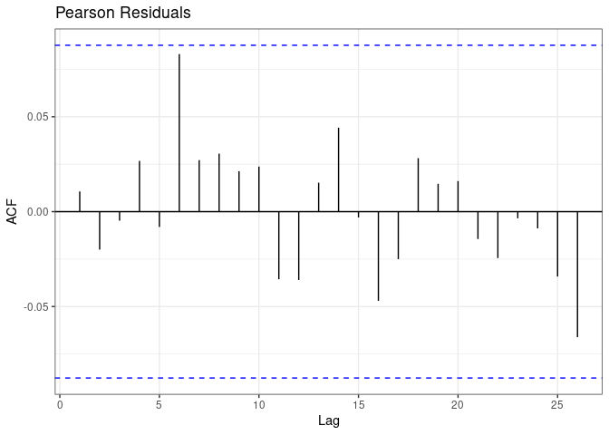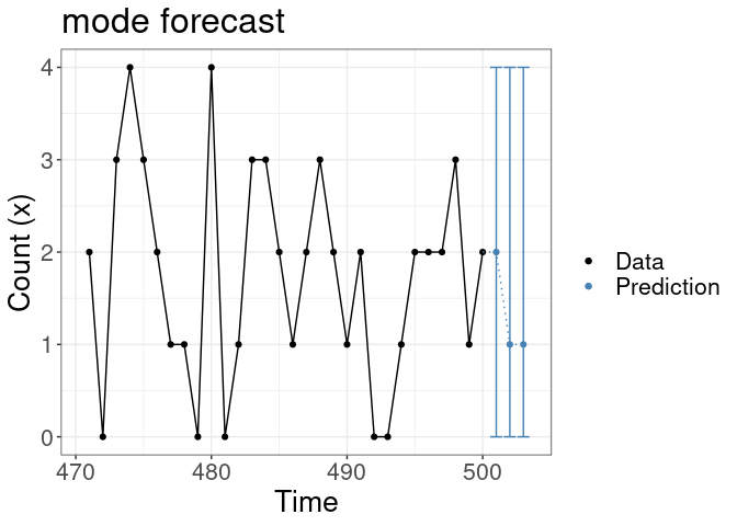Functions to analyse time series consisting of low counts are provided. The focus in the current version is on practical models that can capture first and higher-order dependence based on the work of Joe (1996). Both equidispersed and overdispersed marginal distributions of data can be modelled. Regression effects can be included. Fast and efficient procedures for likelihood based inference and probabilistic forecasting are provided as well as useful tools for model validation and diagnostics.