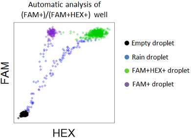 If your experiment matches the criteria for a PNPP experiment (either a (FAM+)/(FAM+HEX+) or a (HEX+)/(FAM+HEX+) experiment), then each droplet will be classified either as a rain droplet or as one of the three expected droplet clusters (FAM+, FAM+HEX+, or double-negative). Rain droplets are droplets that emit considerably more fluorescence than empty droplets, but do not emit enough fluorescence to be assigned into one of the main clusters. Here is the result of analyzing a single well from a (FAM+)/(FAM+HEX+) experiment: