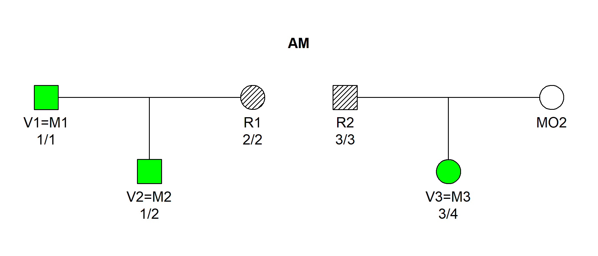 DNA profiles from victims are generally referred to as post mortem (PM) data, while the ante mortem (AM) data contains profiles from the reference individuals R1 and R2.
