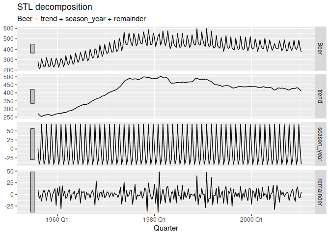 #> 1 STL(Beer ~ season(window = Inf)) 1956 Q1 284 272. 2.14 10.1 282.