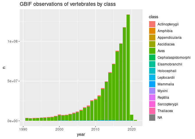 gbif filter(phylum == "Chordata", year > 1990) %>%