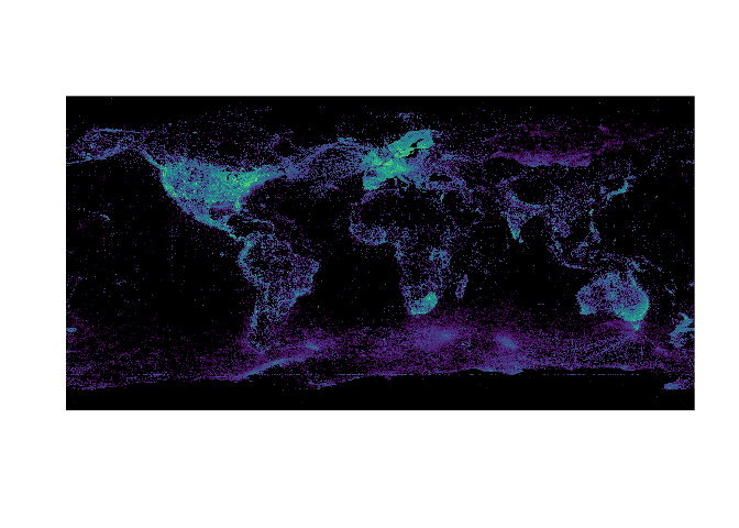 r plot(r, col= viridis(1e3), legend=FALSE, maxcell=6e6, colNA="black", axes=FALSE)