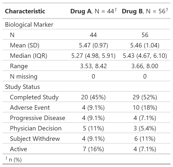 df_patient_characteristics tbl_reg_summary(by = trt, include = c(marker, status))