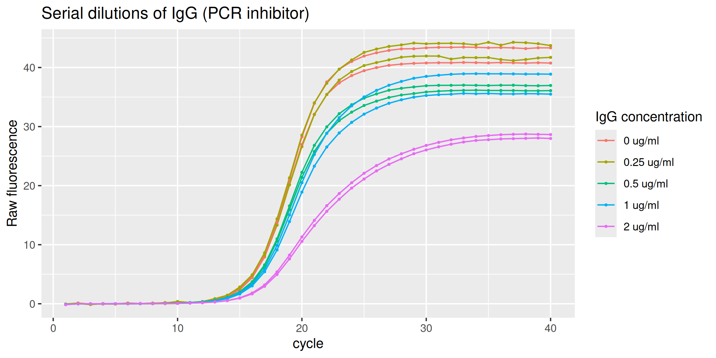 labs(y = "Raw fluorescence", colour = "IgG concentration", title = "Serial dilutions of IgG (PCR inhibitor)") +