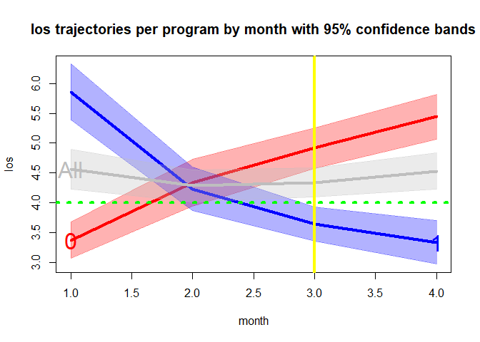 gr1 <- group(x="program", y="los", z="month", dataf=hosprog, dist="t", increment=3, rolling=6)