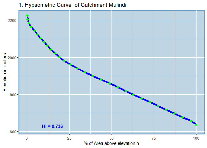 The workhorse function of hypsoLoop is called drawHypsocurves(). It accepts two arguments: a watersheds boundary layer (an sf or sp object) and an digital elevation model (DEM) covering the area of interest (a rasterLayer object). Additionally, the user may specify whether they want to get an output folder created in the root directory or not. If not, the hypsometric curves are drawn in the viewer and a summary table containing the hypsometric integers and other useful information on the sub-catchments is returned.