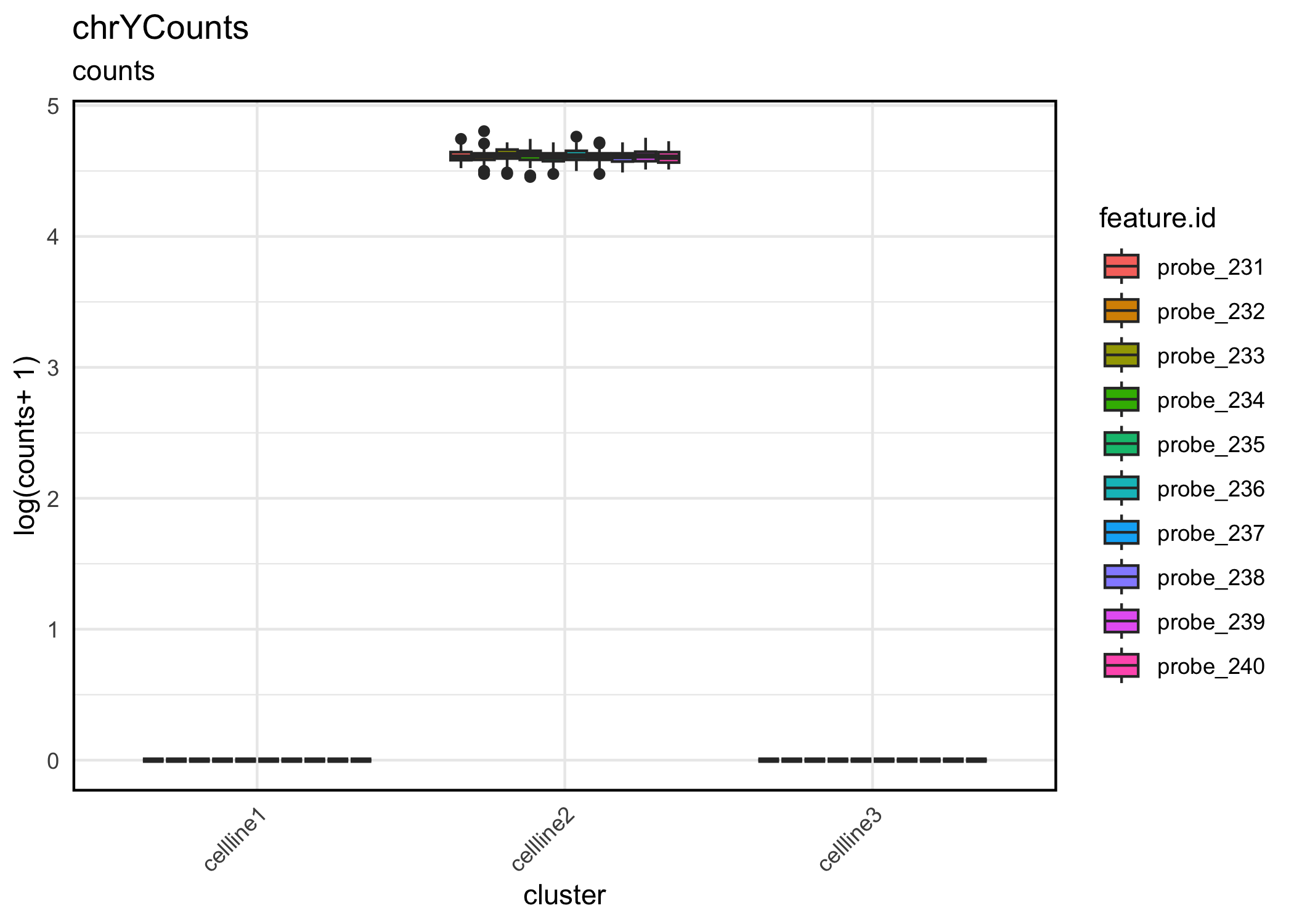 assayBoxPlot(example.exp, alt.exp = "chrYCounts", split.features = TRUE, split.x.by = "cluster")