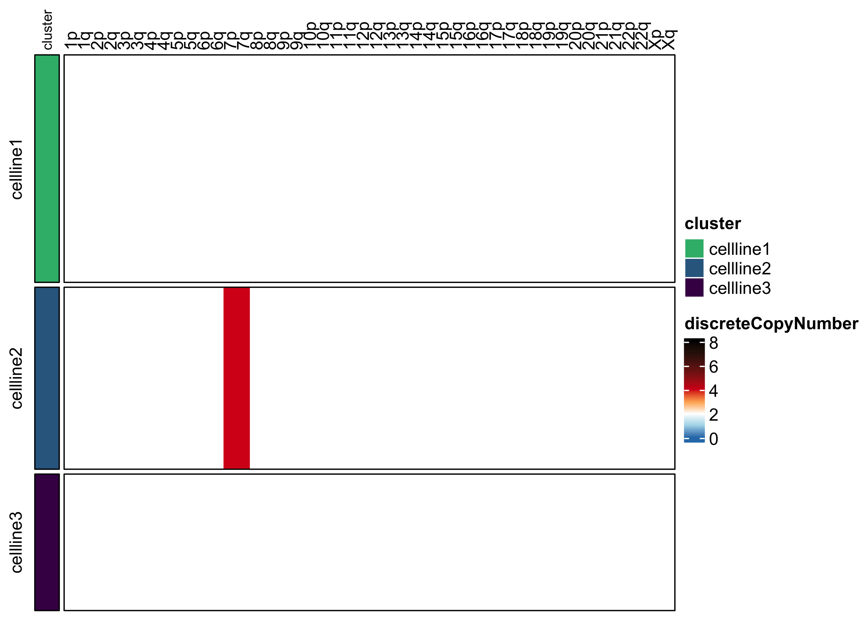 assayHeatmap(example.exp, alt.exp = "smoothedCopyNumberByArm", assay = "discreteCopyNumber", split.row.by = "cluster", annotate.row.by = "cluster", color.preset = "copy.number")