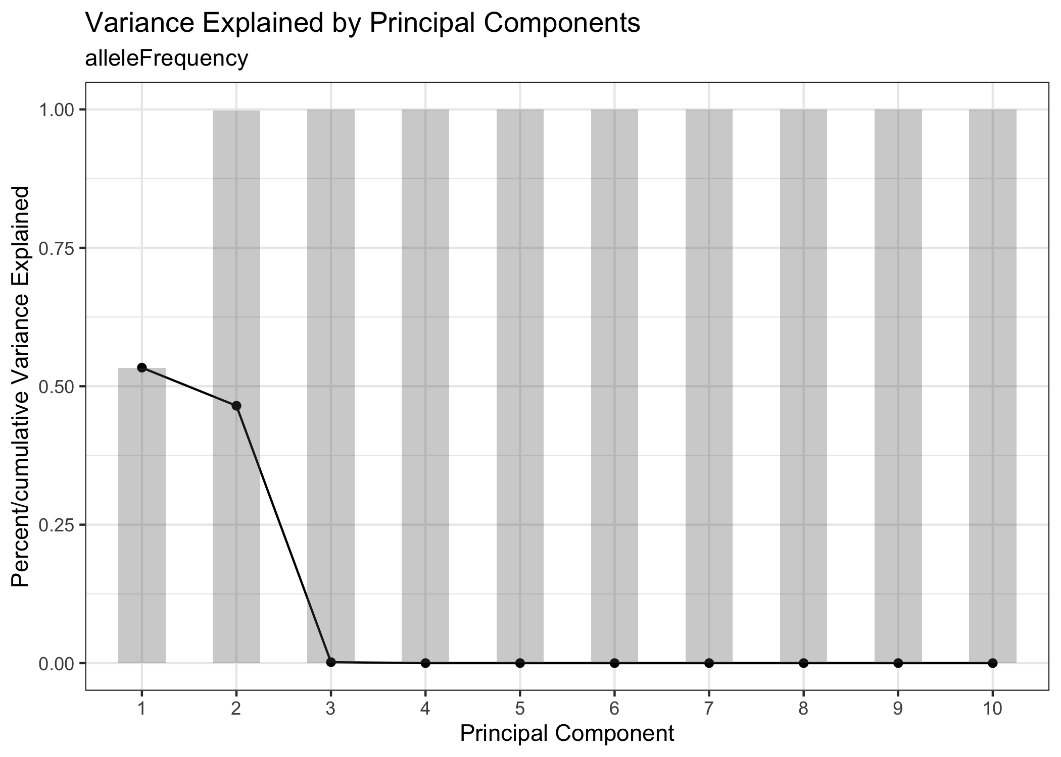 We cluster on allele frequency to partition different cell lines represented in the experiment. First, run PCA and use the knee plot to identify the PCs accounting for the most variation in the dataset.