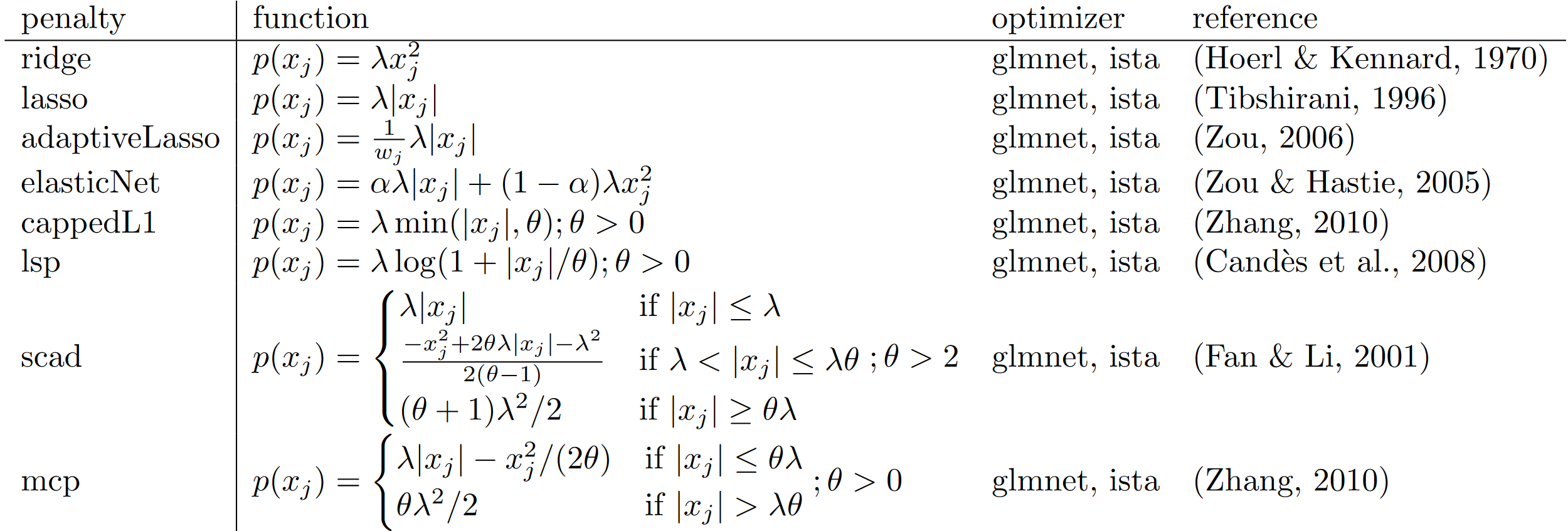 The column “penalty” refers to the name of the function call in the lessSEM package (e.g., lasso is called with the lasso() function).