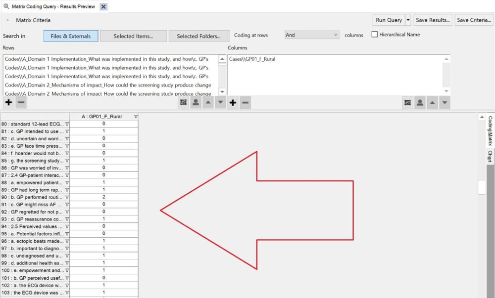include.For our purposes, a coding matrix is an Excel spreadsheet where each row is a unique code, and each column shows how many times that code was mentioned in one interview. NVivo’s Matrix Coding Query tool can produce spreadsheets in the correct format, which we detail below.