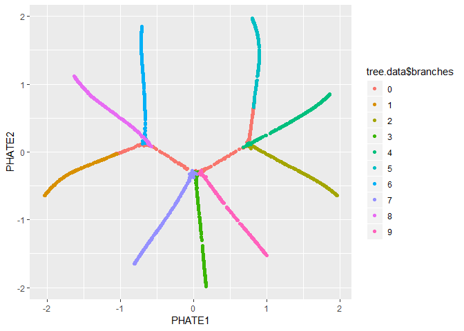 This is a basic example running phate on a highly branched example dataset that is included with the package. You can read a tutorial on running PHATE on single-cell RNA-seq at http://htmlpreview.github.io/?https://github.com/KrishnaswamyLab/phateR/blob/master/inst/examples/bonemarrow_tutorial.html or in inst/examples. Running this tutorial from start to finish should take approximately 3 minutes.