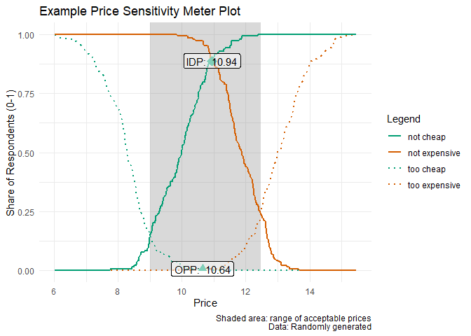 pricesensitivitymeter is an implementation of the van Westendorp Price Sensitivity Meter (PSM) in R. It also covers the so-called Newton Miller Smith Extension which allows to estimate prices that maximize the reach (trial rate) and the revenue.