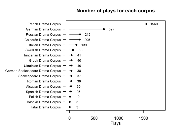 #> fre (1560 plays), ger (697 plays), rus (212 plays), cal (205 plays), ita (139 plays), swe (68 plays), hun (41 plays), greek (40 plays), u (40 plays), gersh (38 plays), shake (37 plays), rom (36 plays), als (30 plays), span (25 plays), pol (10 plays), bash (3 plays), tat (3 plays)