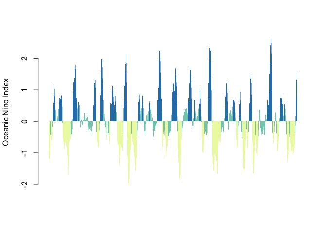 barplot(oni$ONI, names.arg = oni$Date, ylab = "Oceanic Nino Index" ,