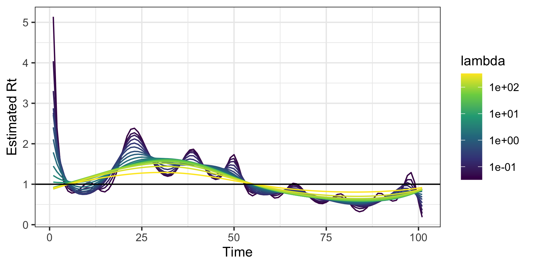 This package uses Poisson likelihood with a trend filtering penalty (a type of regularized nonparametric regression) to estimate the effective reproductive number, Rt. This value roughly says “how many new infections will result from each new infection today”. Values larger than 1 indicate that an epidemic is growing while those less than 1 indicate decline.