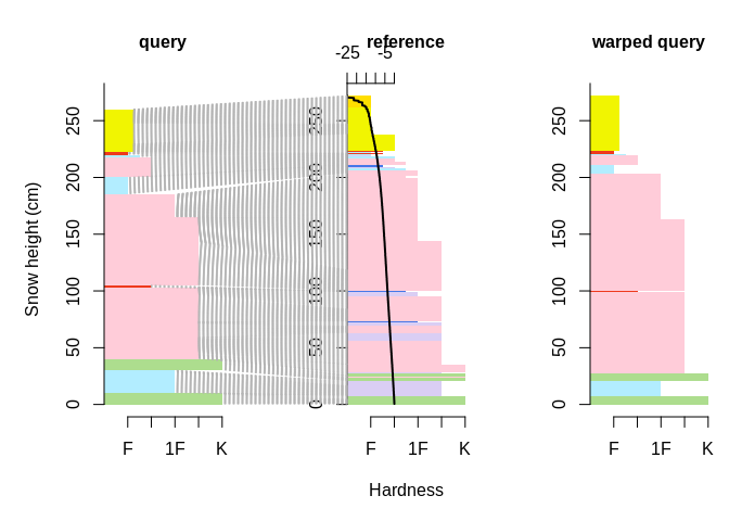 The corresponding layers between the two snow profiles query and reference have been matched, and the layer thicknesses of the query profile have been adjusted, so that the warped query is optimally aligned with the query.