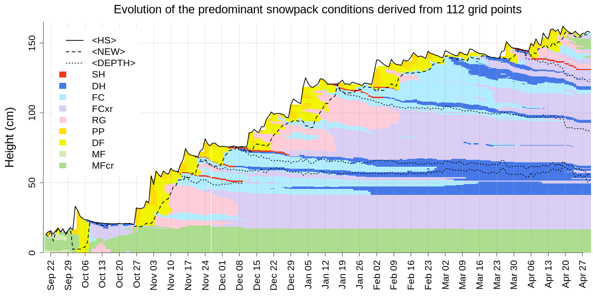 Time series of the average snow profile that illustrates the space-averaged evolution of the snow stratigraphy (visualized by snow grain types). The algorithm captures the median total snow height (solid line, ), the median amount of new snow (dashed line, ), and the median depth of several persistent weak layers (dotted lines, ).