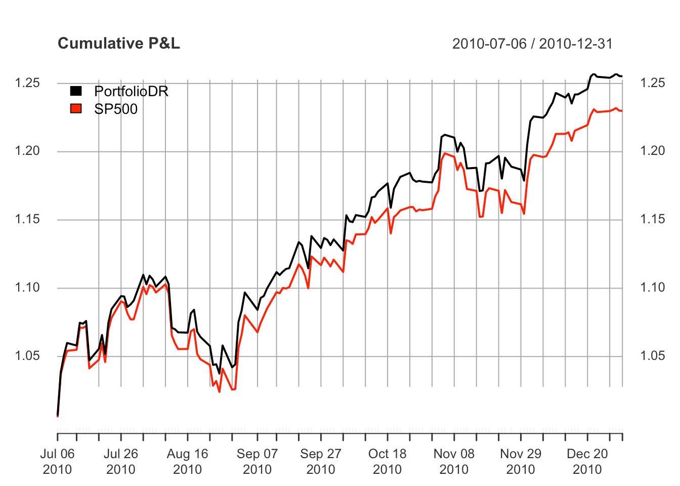 plot(cbind("PortfolioDR" = cumprod(1 + X_test %*% w_dr), cumprod(1 + r_test)),