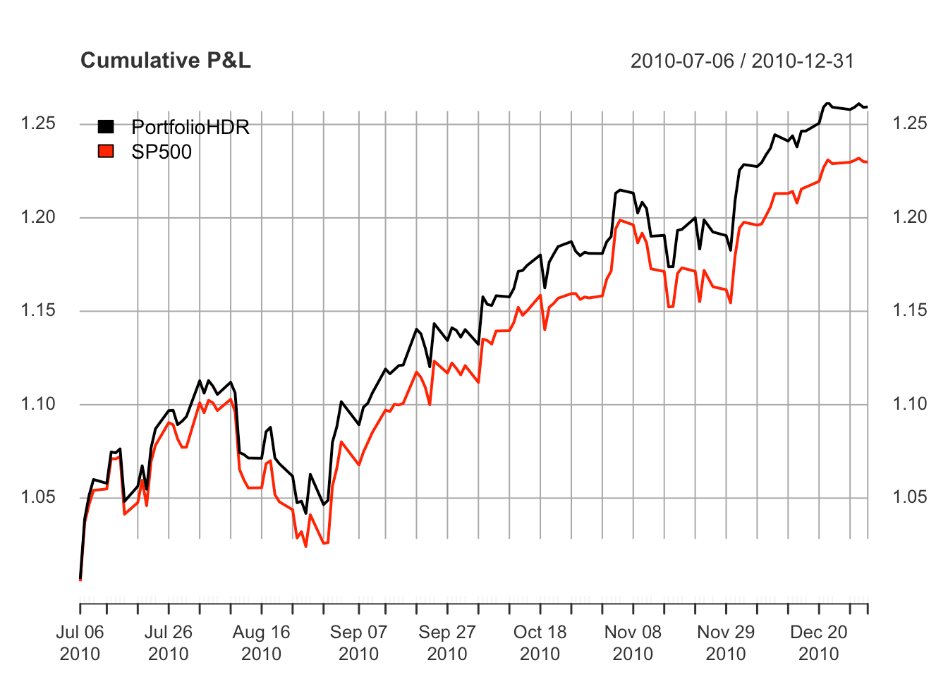 plot(cbind("PortfolioHDR" = cumprod(1 + X_test %*% w_hdr), cumprod(1 + r_test)),
