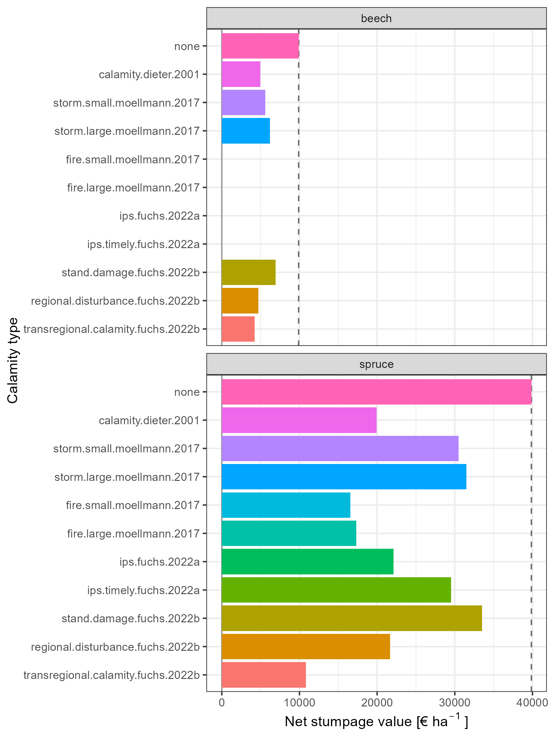 This figure illustrates the different assumptions on the consequences of calamities that we implemented in our package. We compare stumpage values of spruce and beech stands (age 70) without disturbances (“none”) and with the different assumptions on reductions in revenues and increases in costs in the case of a salvage harvest.