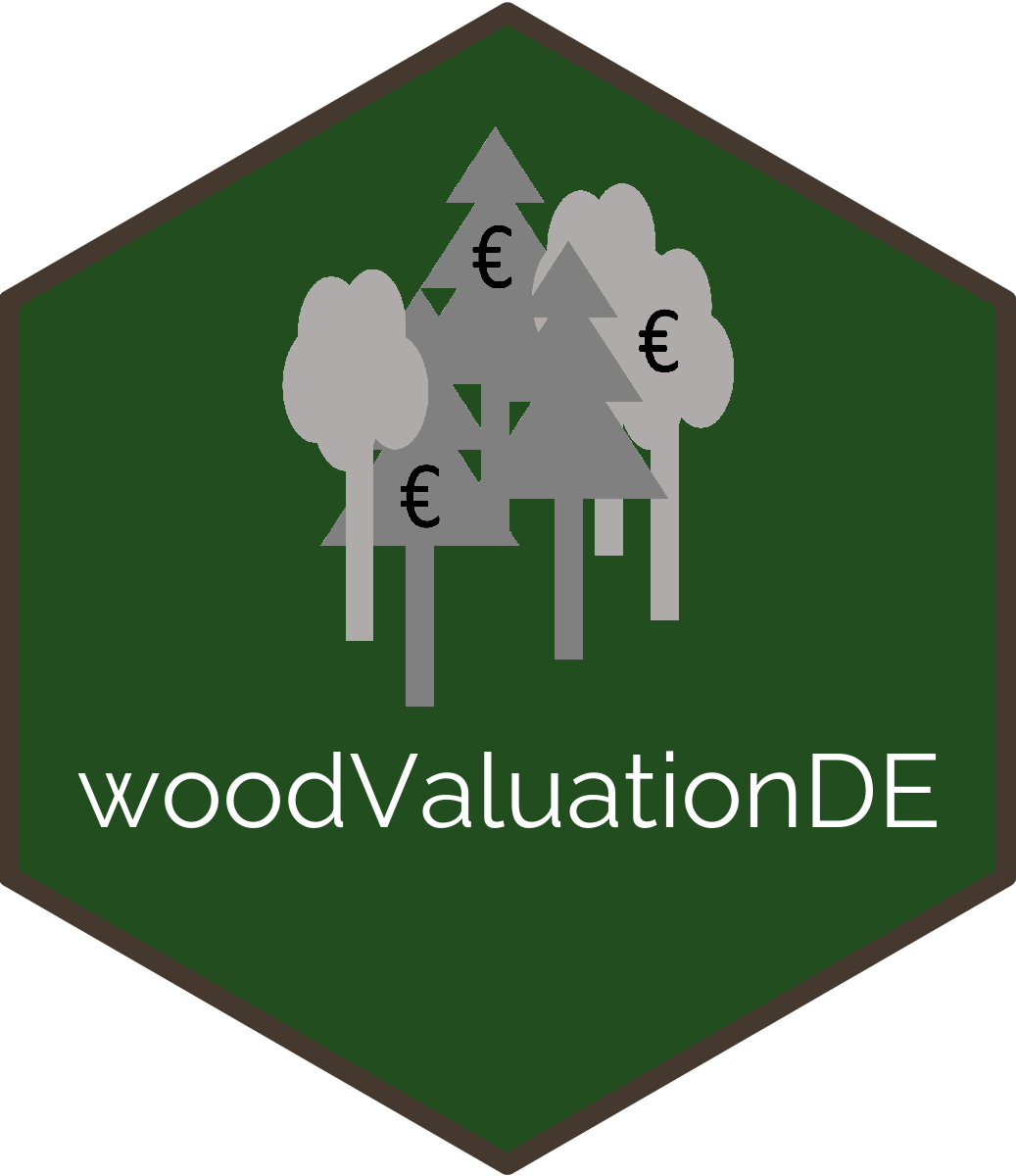 woodValuationDE comprises data and models obtained from several studies. It makes previously published models available for future studies by creating a consistent valuation framework since all1,2 submodels are based on operational harvest and sale data from HessenForst, the public forest service of the Federal State of Hesse in Germany. The underlying assortment tables are taken from Offer and Staupendahl (2018) with corresponding functions for the harvest quantities derived in Fuchs et al. (2023). Wood revenue and harvest cost functions were taken from v. Bodelschwingh (2018). The consequences of disturbances refer to Dieter (2001)1, Möllmann and Möhring (2017)2, Fuchs et al. (2022a), and Fuchs et al. (2022b).