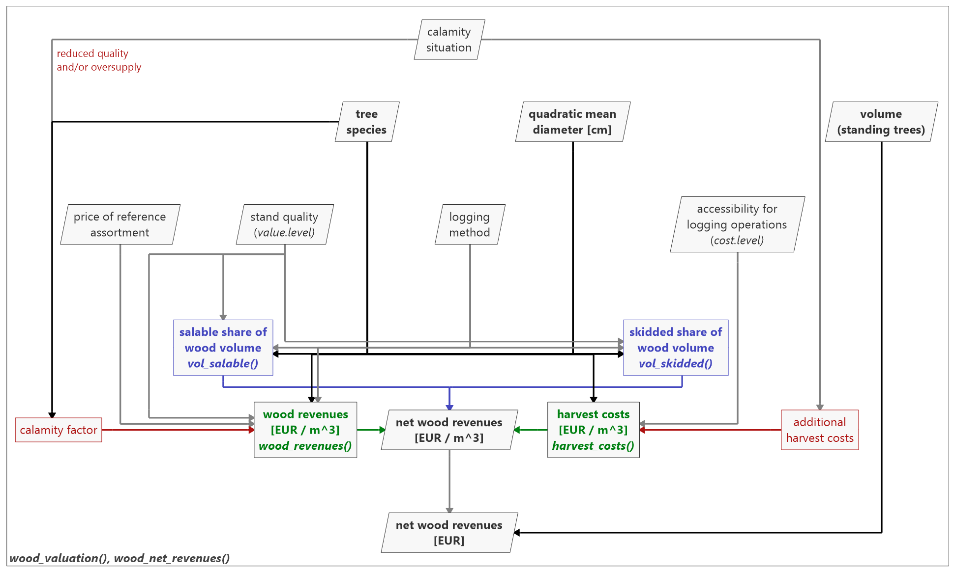 Accordingly, wood_revenues() estimates the revenues per cubic meter of salable wood [EUR m-3] and harvest_costs() the harvest costs per cubic meter of skidded wood [EUR m-3]. Both models depend on the tree species and quadratic mean diameter3 of the harvested trees. Further function arguments are the stand quality, the logging method, and the accessibility of the stand for logging operations. In addition, current market situations can be considered via updated prices for the German reference assortments.