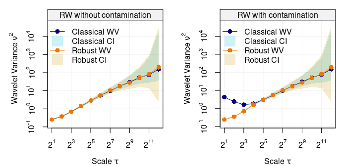 It can be seen how the classic and robust wavelet variance estimates agree when there is no contamination (left plot) but they classic estimates are heavily biased (especially at the first more informative scales) when the random walk has only 1% contamination.