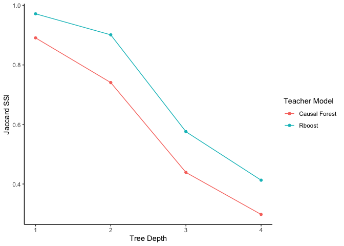 Note that when using CDT, a teacher model must be chosen (the default is a causal forest). To help researchers select an appropriate teacher model, the Jaccard subgroup stability index (SSI) was introduced in Huang et al. (2025). Generally, a higher Jaccard SSI indicates a better teacher model. This teacher model selection procedure can be run as follows:
