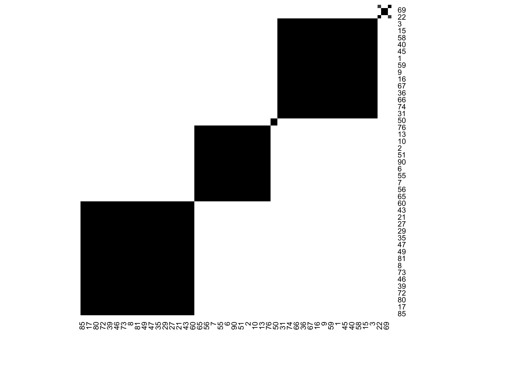 To evaluate how well our tree captures the structure of the RF and replicates its classification, we introduce a procedure to measure the goodness of explainability. We start by visualizing the final partition generated by the RF through a heatmap — a graphical representation of the co-occurrence matrix, which reflects how often pairs of observations are grouped together across the ensemble. Each cell shows a pairwise similarity: the darker the cell, the closer to 1 the similarity — meaning the two observations were frequently assigned to the same leaf. Comparing these two matrices — both visually and statistically — allows us to assess how well E2Tree reproduces the ensemble structure. To formally test this alignment, we use the Mantel test, a statistical method that quantifies the correlation between the two matrices. The Mantel test is a non-parametric method used to assess the correlation between two distance or similarity matrices. It is particularly useful when we are interested to study the relationships between dissimilarity structures. The test uses permutation to generate a null distribution, comparing the observed statistic against values obtained under random reordering.