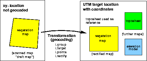 Before rectifying the raw map, you should first create the location in the actual projection system you will be using for your map, with the required geographical boundaries and resolution (see the chapter called Set-up your location). Any projection supported by GRASS may be used. You should watch out that the resolution of the target location is not too low since that could cause the digital map to be quite illegible, depending on the scale. It is, therefore, worthwhile to begin by calculating the transformation between scanning resolution and geographical resolution.
