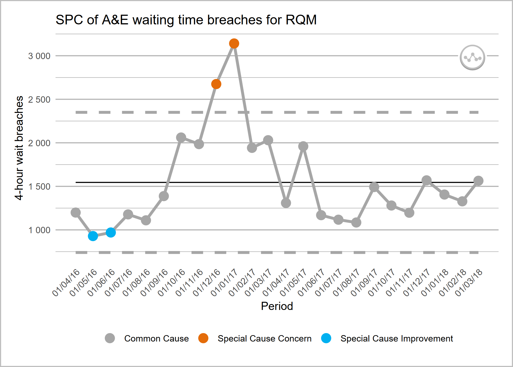 main_title = "SPC of A&E waiting time breaches for RQM",