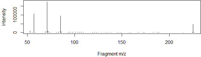plot(int~fragmz, type="h", data=., ylab="Intensity", xlab="Fragment m/z")