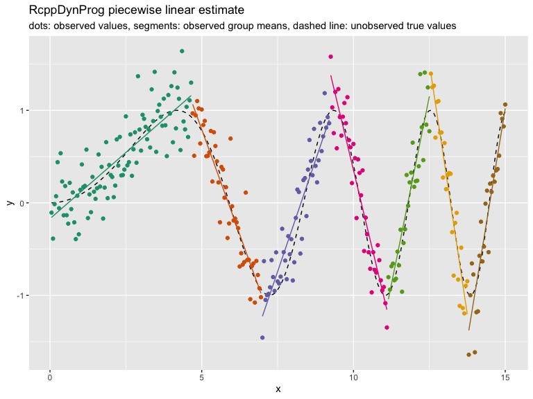 RcppDynProg::solve_for_partition() finds a partition of a relation into a number of linear estimates. Each interval is priced using out-of sample cost via the PRESS statistic plus the specified penalty (to discourage small intervals). Notice, however, the user did not have to specify a k (or number of intervals) to a get good result.