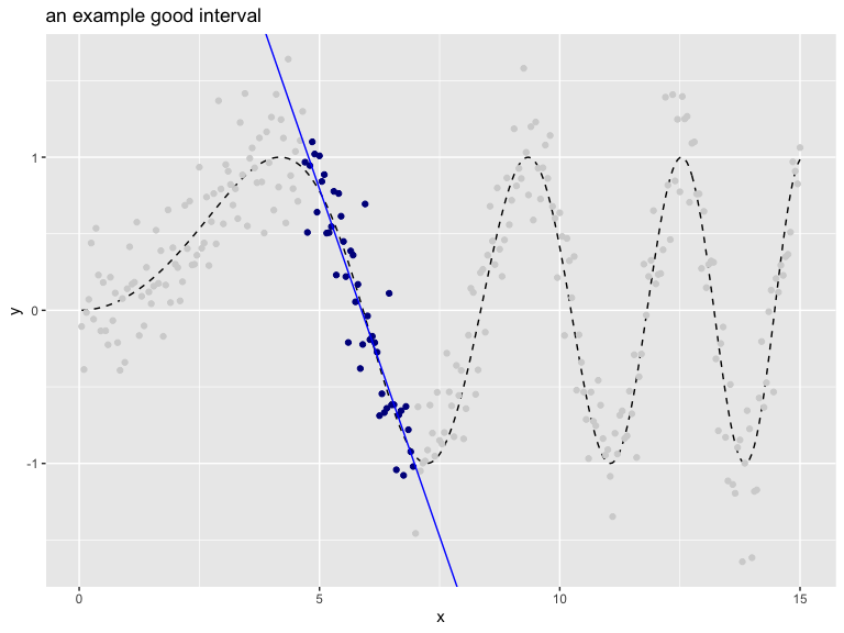 The following interval is a good interval, as all the chosen points (shown in dark blue) are in a nearly linear arrangement. The in-sample price of the interval would be the total sum of residuals of a linear model fit on the selected region (and the out of sample price would be given by the PRESS statistic).