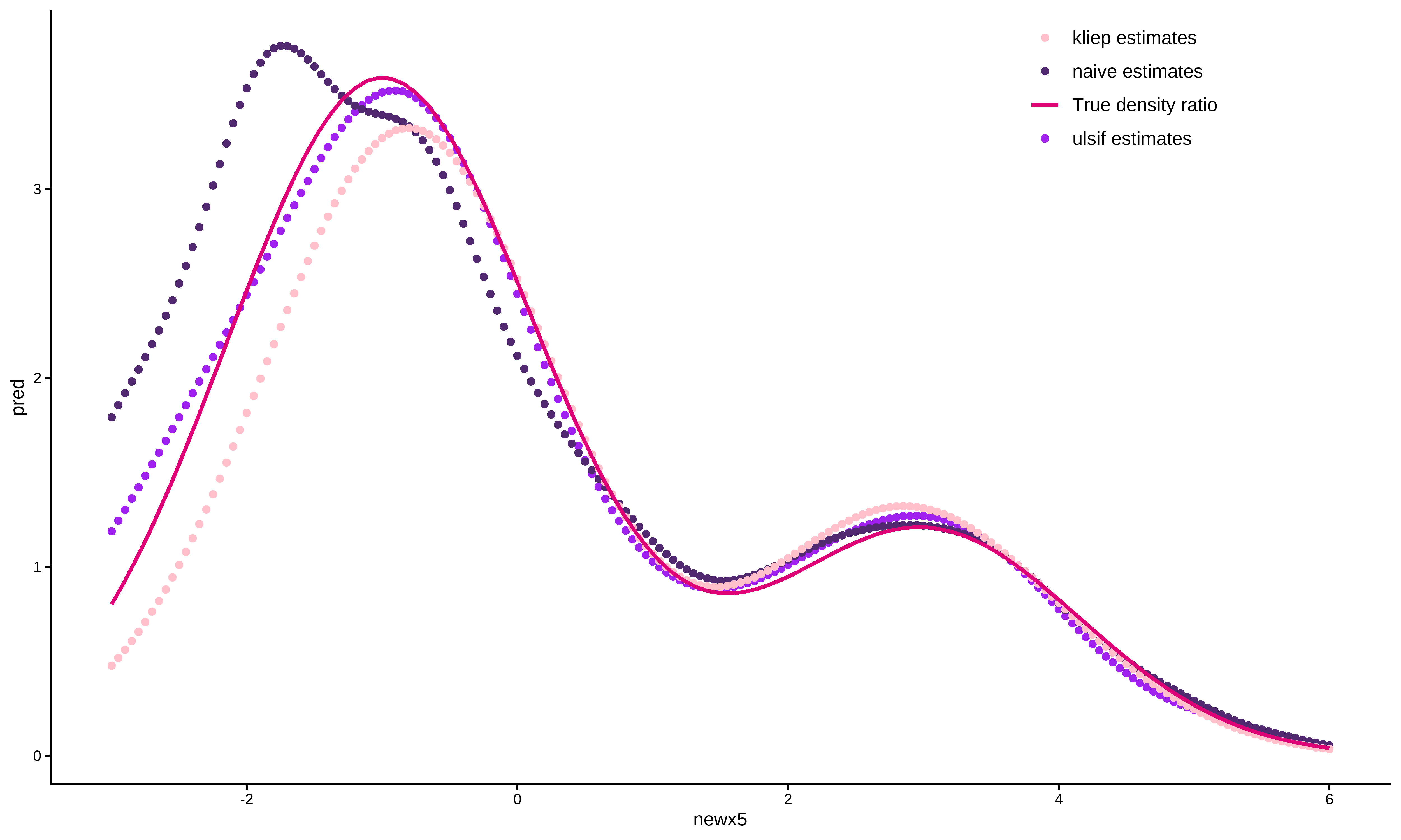 geom_point(aes(x = newx5, y = pred, col = "ulsif estimates")) +