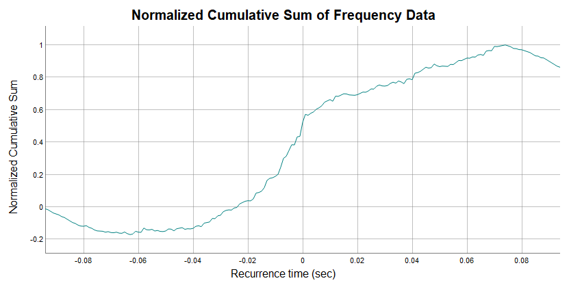 In the graph above you see the x-axis is just like the bins of the cross correlation histogram, representing the time difference between firings of the motor units. The y-axis notes the normalized cumulative sum values for each bin. The mouse can be used to drag a vertical cursor along the graph. This will display x and y values.