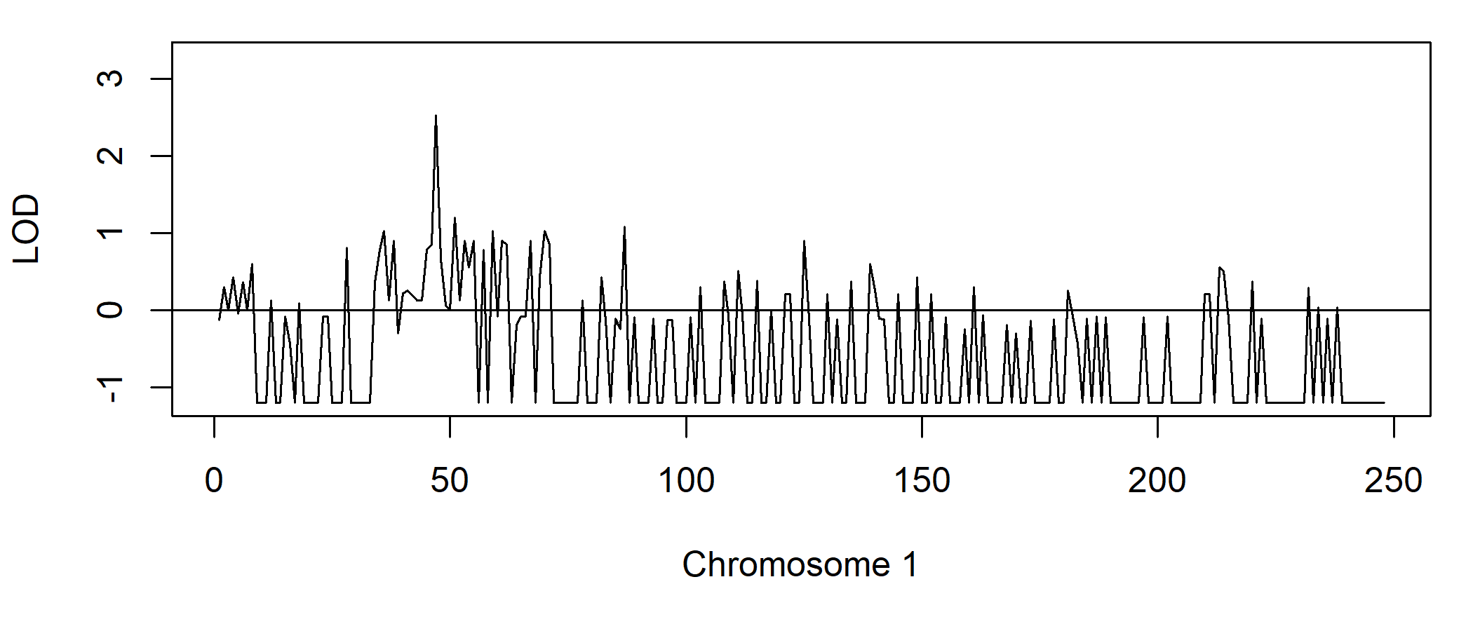 Furthermore, plot() produces a nice graph of the LOD scores: