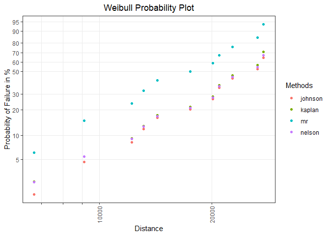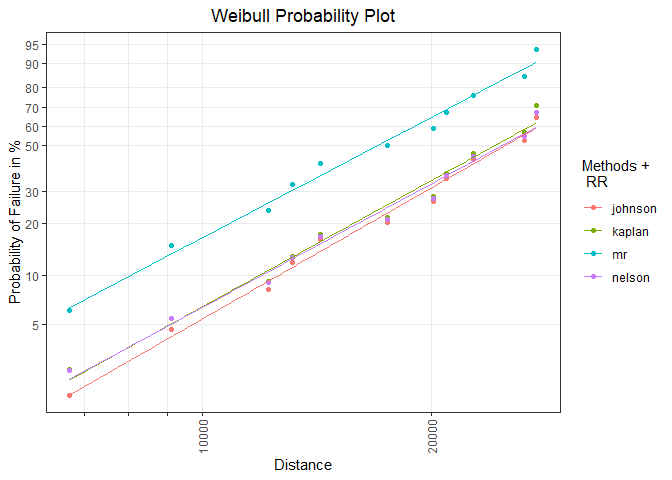 #> Reliability Data with characteristic x: 'distance':