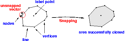 Note: Some people use 'overshoots' deliberately to make sure areas are closed. However, it is necessary to trim these lines afterwards. It is common use to create a square - 'neatline' - around the project area. With this method you can vectorize your map and 'overshoot deliberately as GRASS can trim automatically to the boundaries of the square at a later stage. The square is considered part of the area boundary.